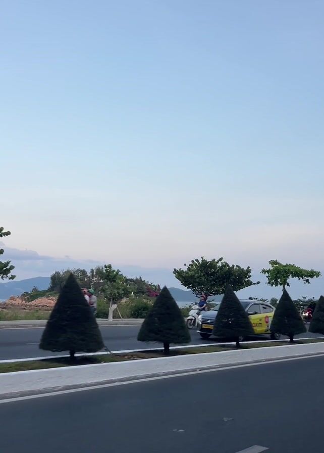 street with neatly trimmed, cone-shaped trees lining the median. Cars and motorcycles pass on the road. There are light posts with red flags and signs in Vietnamese along the median, advertising political slogans or events. The sky is a clear, light blue. In the background, there is a slight view of a body of water and distant hills or land.