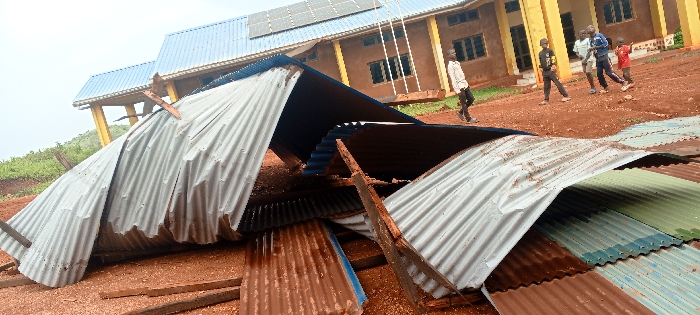 The scene, located in Kundu 1, Democratic Republic of the Congo, depicts a ground-level view of widespread structural debris and human presence. In the immediate foreground, numerous corrugated metal roofing sheets are scattered across reddish-brown earth. These sheets vary in color, displaying silver, faded green, and rusted brown tones, and exhibit significant bending, crumpling, and detachment from their original structure. Interspersed with the metal sheets are fragmented wooden planks and beams, indicative of a collapsed or damaged roof structure. In the midground, an expanse of unpaved reddish-brown earth separates the debris from a two-story building. This building, serving as the primary background structure, features a brown-toned facade with prominent yellow columns and roof overhangs. Its roof is constructed from blue corrugated metal, upon which multiple solar panels are visibly installed. Dark-framed windows are present across the building's facade. Approximately six individuals are observed on the reddish-brown ground in front of the building. One adult male, dressed in a light-colored shirt and dark trousers, is walking from left to right. A group of five other individuals, appearing to be adults and youths, are positioned further to the right, observing the scene. To the far left background, a portion of a lush green hillside is visible under an overcast sky.