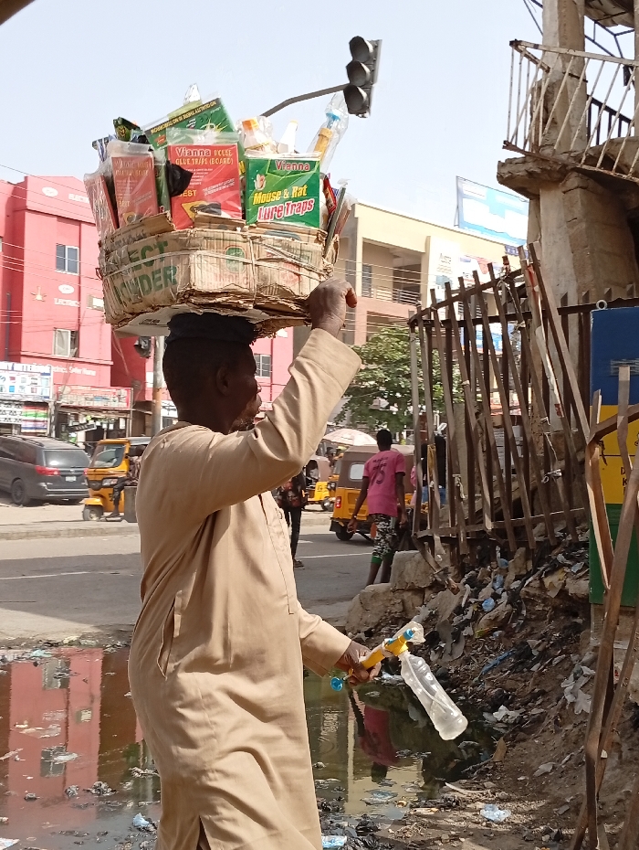 An outdoor scene in Sabon Gari East, Nigeria, captures a street vendor amidst an urban environment