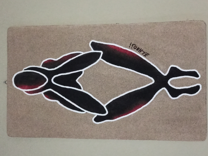 The image displays a vertically oriented piece of artwork, approximately rectangular with rounded corners, mounted against a uniform light beige wall in Florenville, Belgium. The artwork itself is rendered on a light brown, fibrous substrate, possibly cardboard or particle board. A small, dark-colored metal hanging bracket is visible at the top center of the artwork. The central subject is a highly stylized, abstract, and bilaterally symmetrical figure, predominantly black with prominent white outlines and subtle red accents. The figure appears to be in a seated or crouched posture, with abstract limbs extending from a central mass. The upper portion of the figure suggests arms raised to cover the head or face, while the lower portion forms an inverted 'V' shape. Red shading is visible around the upper body mass and within the inner edges of the 'V' shape in the lower body. The signature "ELHADJI" is legibly written in black, oriented vertically, on the lower right quadrant of the artwork. No other objects or individuals are present in the immediate environment.