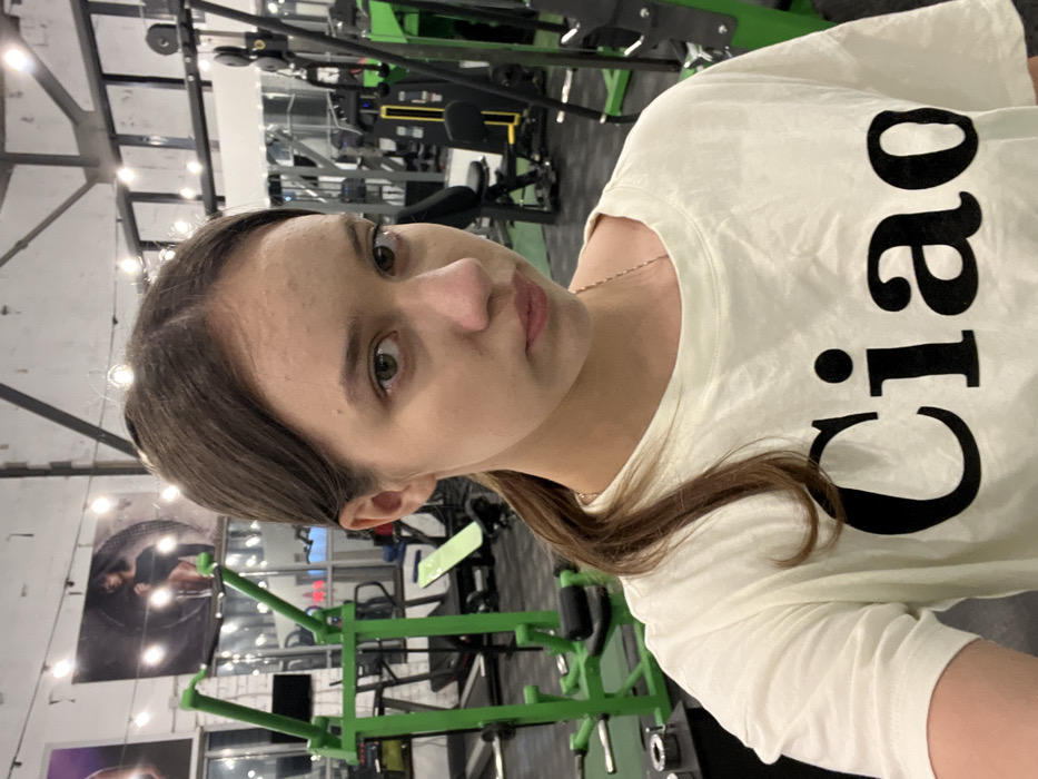 The scene is located indoors within a fitness center or gym in the city of Kozlovo, Russia. The primary subject is a young female, approximately late teens to early twenties, occupying the central and foreground portion of the image. She has dark brown hair, parted centrally and pulled back into a ponytail on her left side, with some loose strands framing her face. Her eyes are light brown or hazel and she looks directly into the camera with a neutral expression, her lips slightly parted in a subtle pout. Visible on her forehead are several small, raised skin blemishes. She wears a light-colored (off-white or very light yellow) short-sleeved t-shirt with the word "Ciao" printed in large black capital letters across the chest. A thin, silver-colored chain necklace is visible around her neck. The background reveals a typical gym environment with various exercise equipment. To the left, a prominent green-framed resistance training machine is visible, likely a lat pulldown or similar apparatus. Further back on the left, a black treadmill and another workout bench are partially discernible. The wall on the far left features a white or light-colored brick texture, adorned with two large posters depicting muscular individuals; one is a male model positioned in front of a large tire, while the other poster is partially obscured. The ceiling is high, featuring exposed structural beams and decorative string lights with exposed bulbs, providing ambient illumination. To the right, dark-colored weight machines, including a cable machine, are visible, along with reflective mirrored walls that partially reflect other gym equipment. The flooring appears dark, consistent with gym surfacing. No other individuals are visible, and the woman is not actively engaged in exercise.