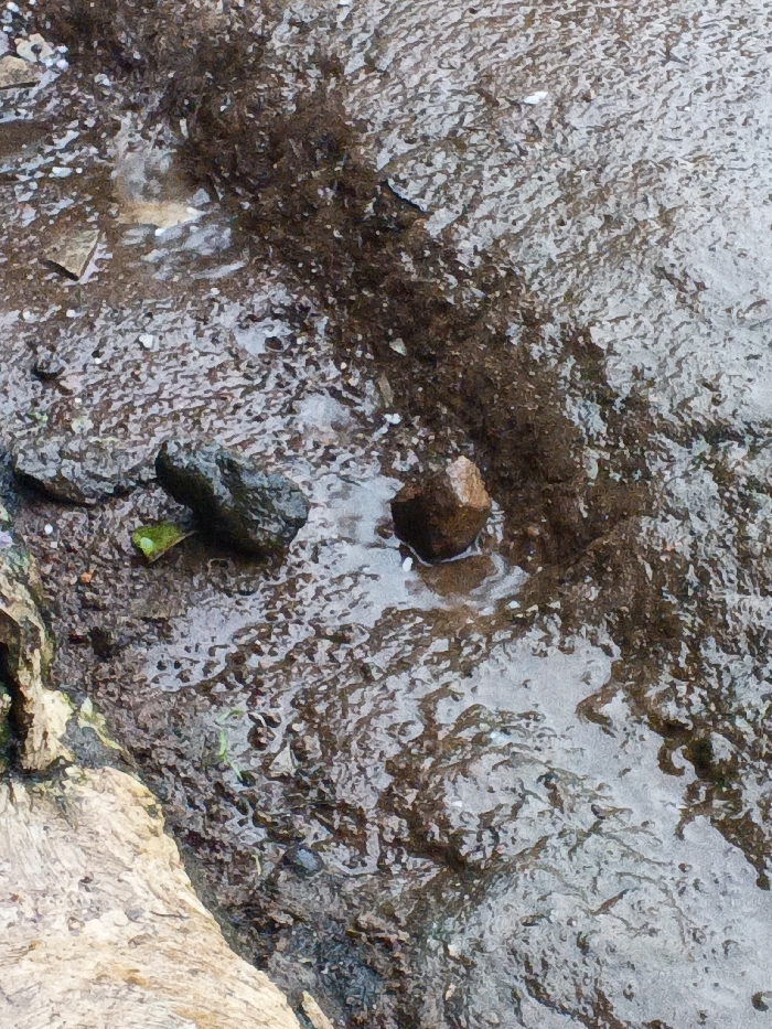 The ground is wet and rocky. Two larger rocks sit near the edge of a concrete or wooden structure. A small green leaf is near one rock. The water creates a reflective surface, enhancing the texture of the ground and rocks. A dark, dirt-filled channel runs diagonally across the upper portion of the scene. The overall tone is muted, with earth tones dominating.