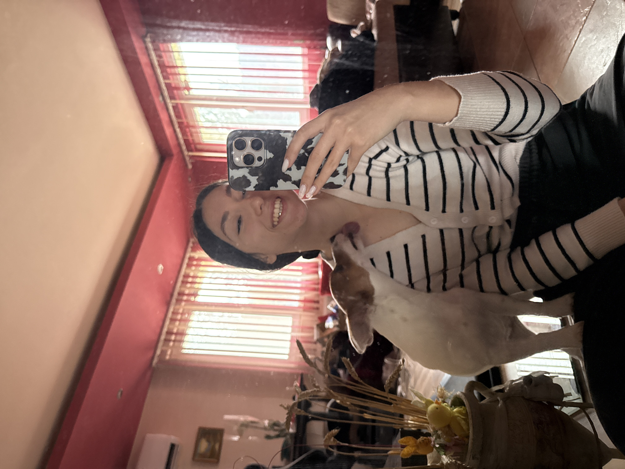 A young woman takes a selfie in a mirror, which captures her partially. She has dark hair and is wearing a white and black striped cardigan. Her phone has a black and white cow-patterned case. A dog is licking her neck. The background shows a room with red walls, a window with horizontal blinds, and a glimpse of an interior scene with a vase containing dried wheat and yellow flowers. The location is potentially the city of Galabovtsi, Bulgaria.
