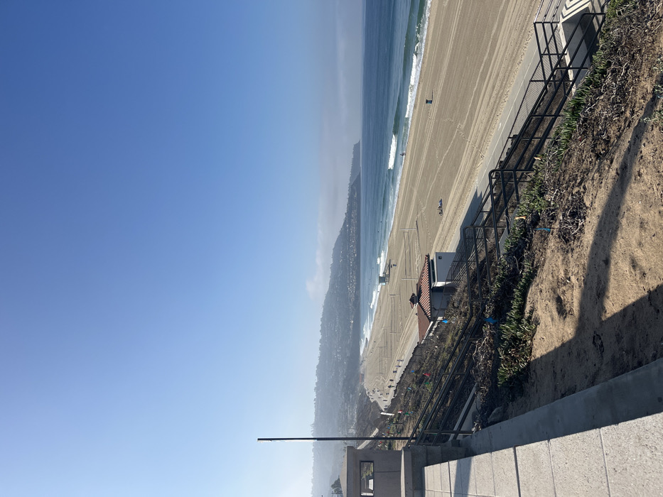 An elevated, wide-angle view captures a sunny day at Redondo Beach, United States. The scene features a sandy coastline extending into the distance under a clear blue sky, with a hazy horizon line obscuring distant hills. In the immediate foreground, to the left, a light grey concrete barrier runs horizontally. Above it, a tall, thin dark pole stands vertically. To the right of the barrier, a steep sandy embankment descends, sparsely covered with dry vegetation and marked with small blue and green flags. A set of black metal stairs and railings are built into this incline, leading towards the beach level. Mid-ground, positioned on the embankment near the stairs, is a small, light-colored building with a red-tiled roof, likely a public facility. Below the embankment, a paved multi-use path runs parallel to the ocean. The wide, light-colored sandy beach extends from this path towards the water. Visible on the sand are tire tracks from a beach grooming vehicle, footprints, and various individuals. A blue lifeguard tower stands on the sand, and further down the beach, volleyball nets are visible. Several dark objects, possibly trash receptacles, are scattered across the sand. A few individuals are lying on the sand near the water's edge, and others are walking along the shoreline. The Pacific Ocean occupies the right and central background, displaying gentle waves breaking onto the beach. Several individuals are present in the ocean, engaged in water activities. The distant coastline features a series of hills dotted with residential structures, partially veiled by a light atmospheric haze. The upper portion of the image is dominated by a clear, unclouded blue sky.