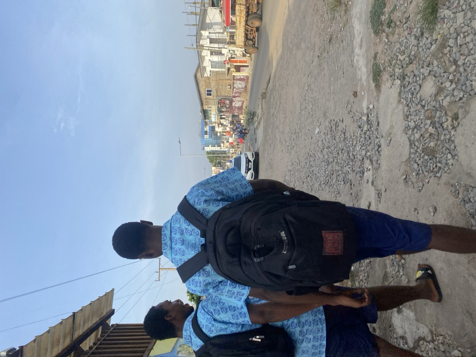 Two young males, likely students, are depicted walking away from the camera on a gravel and partially concrete sidewalk in a urban area of Accra, Ghana, under a clear sky