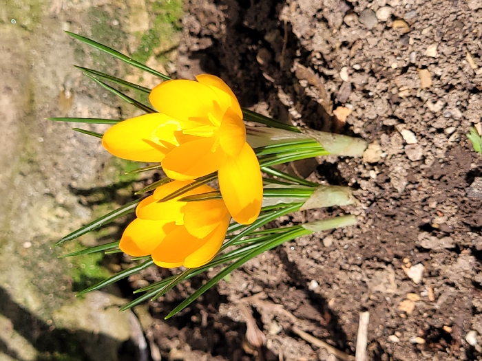- "The image displays a close-up, ground-level view of three bright yellow crocus flowers in full bloom, accompanied by their distinctive dark green, lanceolate leaves" by FM-laGG22, licensed under CC BY 4.0