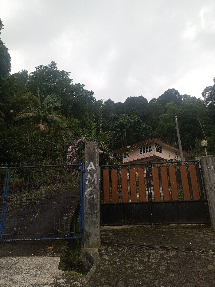 The image presents a static, wide-angle view of a residential property entrance in Bhupalpally, India, set against a backdrop of dense vegetation under an overcast sky. In the immediate foreground, the ground is a rough, textured surface, likely a combination of concrete and stone, exhibiting some moss or dirt. Two distinct gate sections are visible. To the left, a blue metal gate with a grid-like pattern appears partially open or recessed, leading to an unpaved or overgrown path. To its right, a larger, dark metal double gate is closed. This main gate features vertical brown wooden panels in its upper section and a solid black lower section. Two concrete gate posts flank these entries. The left post displays "ANG" spray-painted vertically in white. The right post bears the numeral "57" near its upper right corner and has an attached outdoor lamp fixture with a spherical glass diffuser. Behind the gates and on an elevated plane, a two-story house is visible. It features light-colored walls, possibly cream or beige, and a dark reddish-brown roof. Multiple small, rectangular windows are evenly spaced across its facade. The entire midground and background are dominated by lush, dense green foliage, consistent with a heavily vegetated hillside or forest rising steeply behind the property. Pink flowering bushes are present to the left of the main house structure. The sky is uniformly gray and overcast. No individuals are present, and no actions or interactions are depicted.