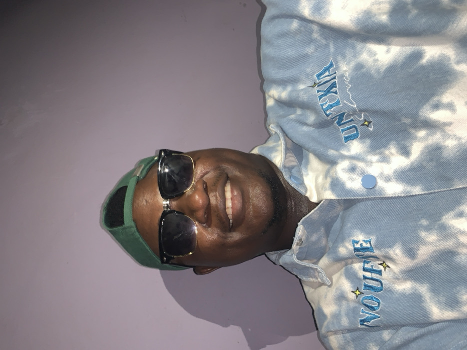 An adult male with dark skin is depicted in a close-up portrait, smiling directly at the viewer, showing teeth. He wears a green baseball cap reversed on his head, featuring a silver buckle. Dark-lensed sunglasses with black frames and gold-colored lower rims cover his eyes. He is dressed in a light blue and white tie-dye shirt or jacket with light blue buttons. The garment has embroidery on the left chest spelling 'NOUEUE' and on the right chest, 'UNTXIA STUDIOS', both accompanied by small star-like designs. The background is a plain light purple wall, with a shadow visible to the subject's left, indicating an off-camera light source. The setting is indoors. No specific visual elements are present in the image to verify a location within Akwanga, Nigeria.