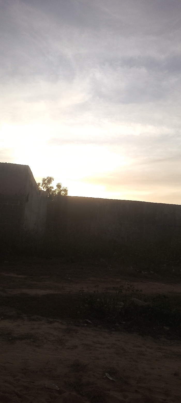 The image displays an outdoor scene at either sunrise or sunset, characterized by a bright, low light source, presumably the sun, located on the left horizon, casting a strong glare. The upper two-thirds of the frame consists of an overcast sky with scattered, diffuse clouds, predominantly light grey and white, transitioning to a luminous white-yellow near the horizon. A long, dark-silhouetted wall or embankment extends horizontally across the mid-ground from left to right. Behind this wall, slightly left of center, a cluster of silhouetted trees or dense foliage is visible. On the far left, the upper portion of a dark structure with a sloped roofline is partially visible, also silhouetted. The lower third of the image depicts uneven, reddish-brown earth, indicative of an unpaved area or dirt path, with sparse, dark-toned vegetation and some scattered debris. No individuals, discernible actions, or interactions are present. The specific location within the city of Unknown, Unknown, is not identifiable from the provided visual evidence.