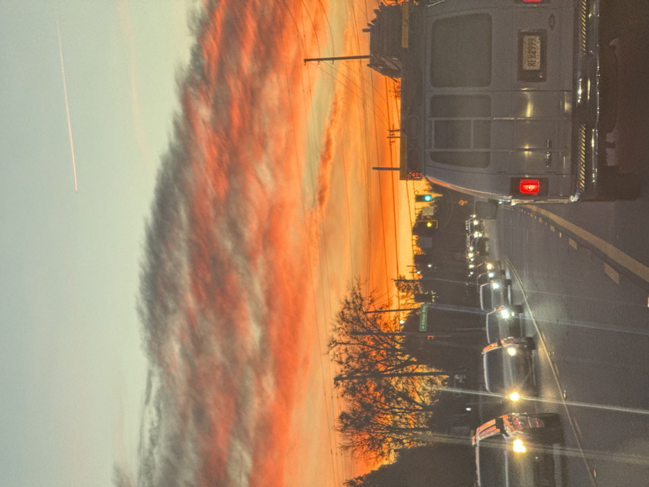 An image shows a sunset in the background with streaks of orange, red, and gray clouds. A line of cars drives along a road in the foreground. A white van with the license plate "REE2999" is in the foreground. A contrail is visible in the sky. A street sign saying "Village Way" is visible on the side of the road. There are utility poles and lines strung throughout the scene.
