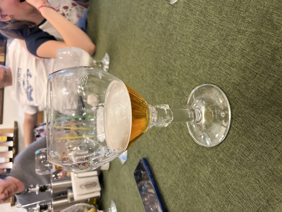 The scene is set indoors at a restaurant in Smolyan, Bulgaria. A clear, chalice-style glass containing approximately one-third of an amber liquid topped with a white foam head occupies the immediate foreground, resting on a dark olive-green tablecloth. A faint emblem or crest is visible on the side of the glass. To the left of the prominent glass, a dark blue smartphone lies face down. In the blurred background, three individuals are partially visible, seated around the same table. To the far left, an adult with light hair, wearing a grey garment and a necklace, is shown from the chest up. Centrally, another adult wears a white t-shirt featuring a blue graphic. To the right, a third adult, with dark hair and wearing a two-toned top with a red bracelet on the left wrist, is visible. Additional table objects include various other empty or partially filled glasses, a set of metal and glass cruets, and a white napkin holder. A wooden shelf holding multiple bottles is discernible on the wall in the distant background. The environment suggests a public dining establishment.