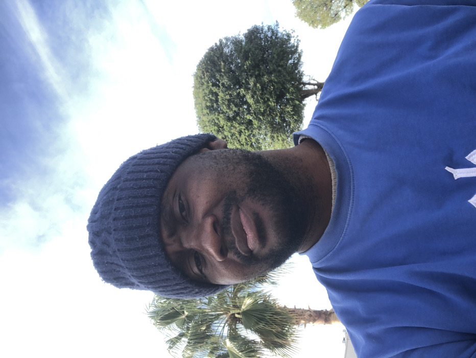 n adult male outdoors in النعيلة, Saudi Arabia. He has dark skin, a short dark beard, and a mustache. He is wearing a navy blue knitted beanie and a blue long-sleeved sweatshirt, with a light-colored undershirt visible at the collar. The man looks directly at the camera with a neutral expression. The background features a bright, cloudy sky, a palm tree on the left, and a dense green deciduous tree on the right. The scene is illuminated by daylight.
