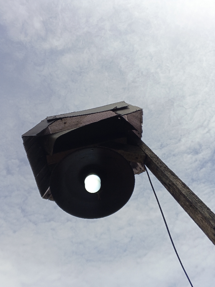 A low-angle shot features a weathered, metal-shaded lamp affixed to a wooden post. The lamp is illuminated, casting a bright glow. A black cable extends from the fixture downward. The metal shade shows signs of wear and tear. The sky is visible in the background, with light blue hues and scattered cloud formations.