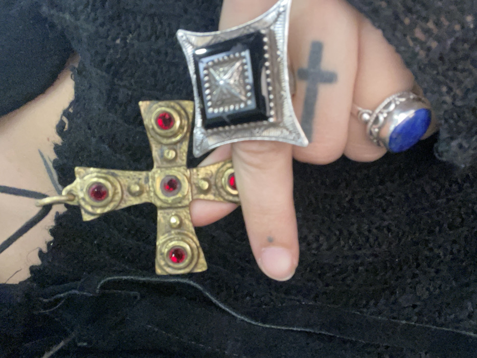 A close-up, vertically oriented image depicts a person's upper torso and right hand. The individual wears a black, textured garment, possibly knitted. Suspended around the neck by a black cord is a gold-toned, ornate cross pendant embellished with five prominent red cabochon stones. The right hand extends into the frame from the lower right, with the index finger positioned near the base of the cross pendant. A small, dark, circular mark or tattoo is visible on the tip of the index finger. The middle finger features a large, square, silver-colored ring with a central black gemstone and a raised, patterned design. A faint cross tattoo is visible on the ring finger. The pinky finger wears a smaller silver-colored ring set with an oval blue stone. The background is indistinct and offers no discernible information regarding a specific location within Paris, France.