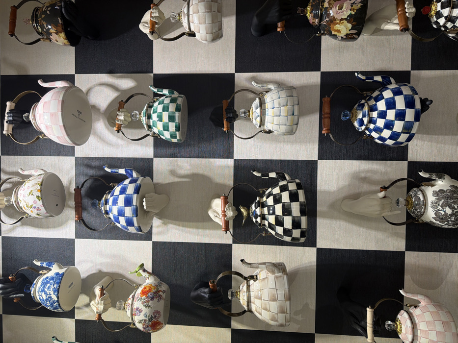 The image displays an interior retail store wall exhibit, identified as a MacKenzie-Childs display located at 6 East 57th Street, New York, NY. The wall is covered in a large-scale checkerboard pattern, alternating between black and off-white squares. Twenty-four decorative teapots (or kettles) are mounted on this wall in a grid arrangement, with one teapot positioned within each checkerboard square. Each teapot is suspended by its handle, which is held by a sculpted, disembodied hand mounted to the wall. The hands vary in color, appearing white, black, or skin-toned. The teapots exhibit a variety of intricate patterns, including distinctive checkerboard designs in blue and white, pink and white, green and white, black and white, and beige and white. Other teapots feature elaborate floral patterns on white or dark backgrounds. Many teapot lids are topped with decorative finials, such as clear faceted spheres, colored spheres, or small gold bird figurines. The scene is evenly lit, casting soft shadows of the teapots and hands onto the wall.