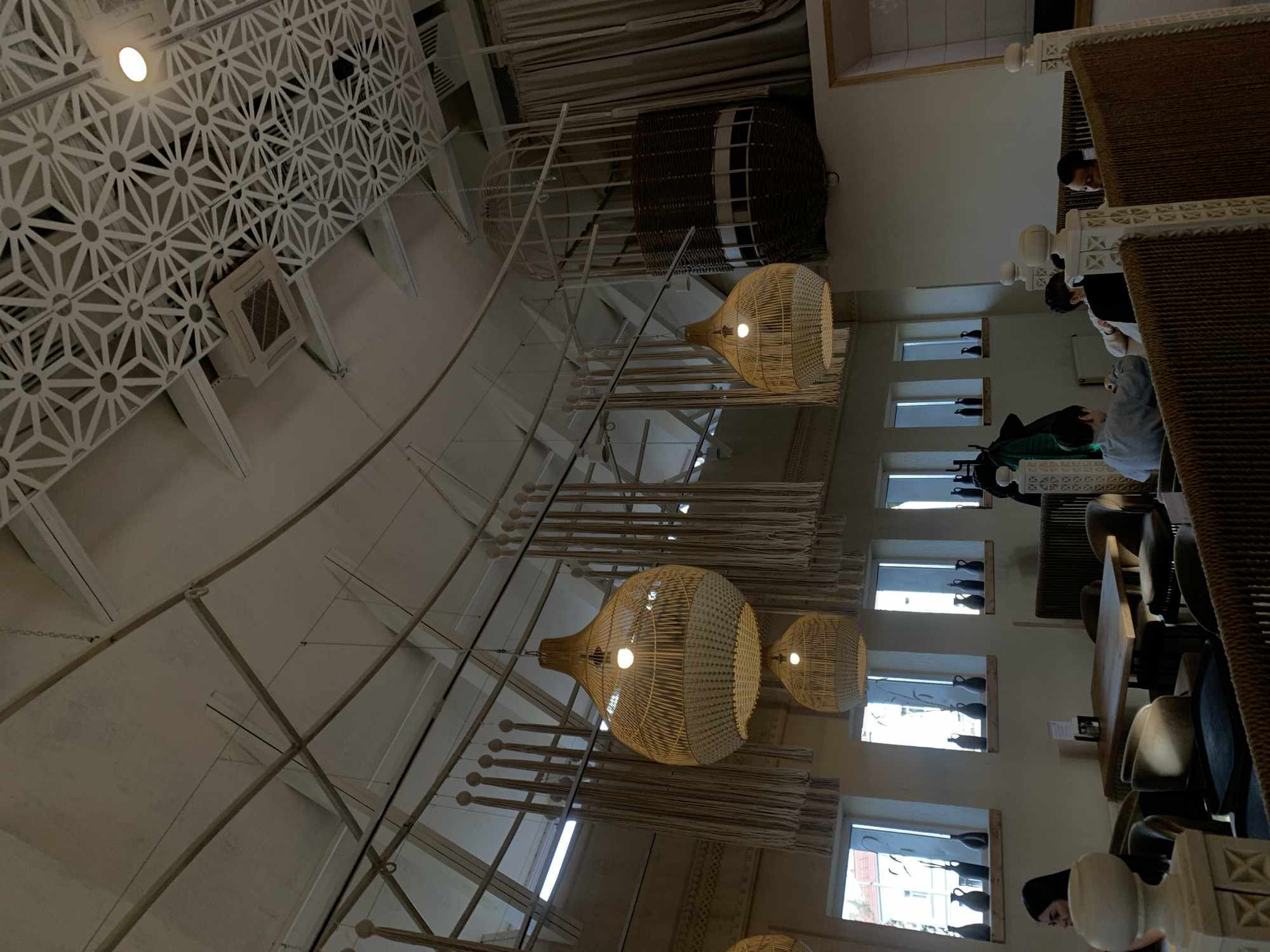 The photograph depicts the interior of a restaurant in Hrodna, Belarus. The ceiling is adorned with a white, patterned design and exposed structural beams. Several rattan pendant lamps of varying sizes hang from the ceiling, providing illumination. The restaurant has tables and chairs, with patrons seated and engaged in conversation or dining. The scene is captured from a slightly angled perspective, providing a view of the restaurant's decor, lighting, and ambiance. Numerous windows line the interior walls. The establishment has distinctive interior decoration elements, creating a visually appealing dining experience.