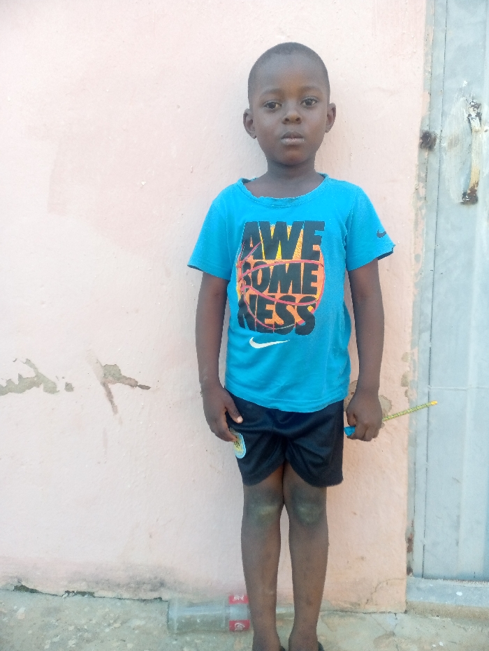 - "A young, dark-skinned male child, approximately 5-7 years old, stands facing forward against a light peach-colored, distressed concrete wall" by FM-Uv6B72, licensed under CC BY 4.0