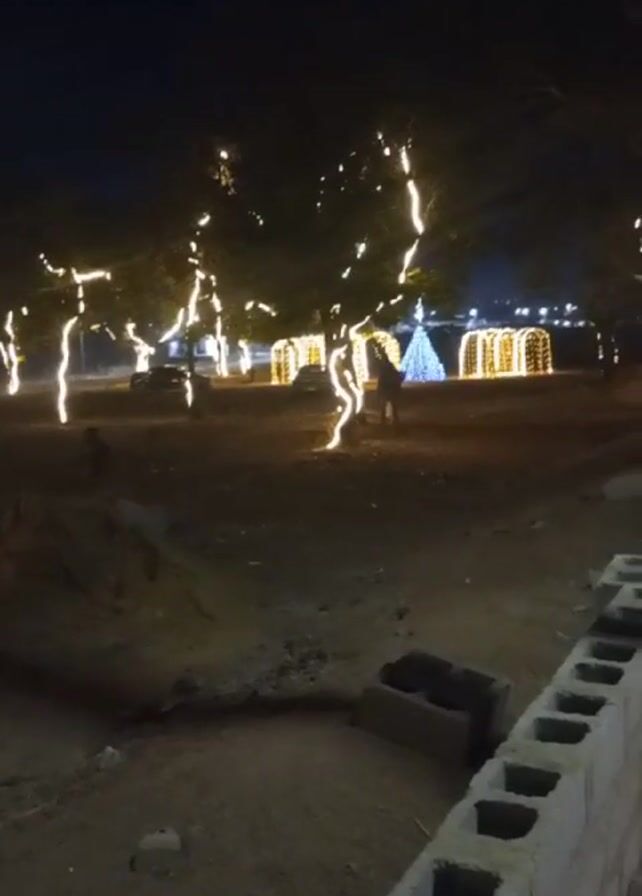 At night, the scene shows a dirt-covered area, likely a park or public space, with sparse lighting and various Christmas decorations. Several trees are adorned with white string lights, winding up their trunks and branches. In the distance, there are more illuminated decorations, including archways of light and a cone-shaped structure that appears to be a Christmas tree. Two individuals can be seen walking amidst the decorations. The foreground features a low wall constructed from concrete blocks. The overall atmosphere suggests a festive, albeit somewhat sparsely decorated, outdoor Christmas display.