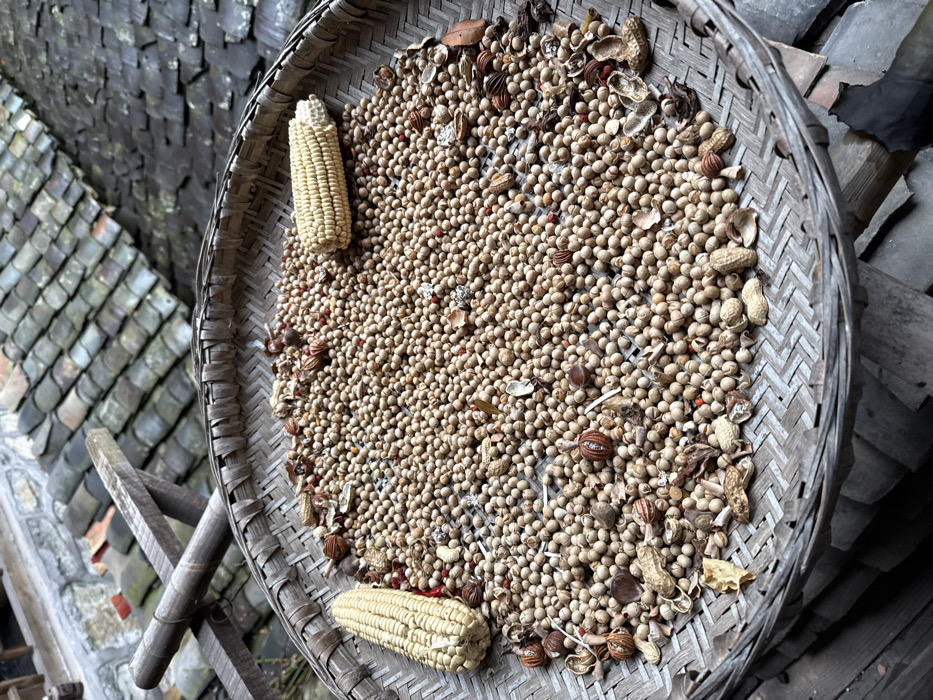 The image displays a large, circular, woven bamboo winnowing basket positioned outdoors in Gongtan, China. The basket is filled with a dense layer of small, uniform, light brown, spherical seeds, consistent with dried soybeans. Two husked and dried corn cobs are present within the seeds: one on the left side of the frame, oriented horizontally, and another on the right, also horizontal with a truncated end. Scattered among the primary seeds are various organic fragments, including empty and partially shelled peanut pods, darker brown seed husks (some resembling star anise pods), and occasional small red specks. The background features the weathered, dark grey/brown overlapping roof tiles of traditional buildings, indicating an elevated perspective. A rough wooden beam structure, potentially part of a drying rack or railing, is visible in the upper-left, above stone masonry. No individuals are present in the scene.