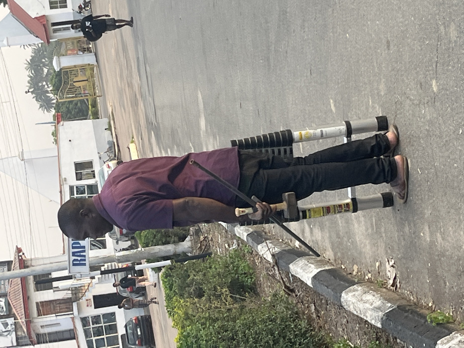 - "A man in a purple shirt and black pants stands on a street next to a curb painted in black and white stripes" by FM-Ndipm1, licensed under CC BY 4.0