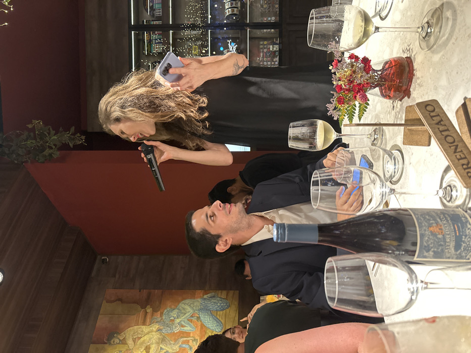 A woman with long curly hair holds a microphone while looking down at a seated man in a suit. He looks up at her. They are gathered around a table set with wine glasses, a bottle of wine, and a small floral arrangement. Another person holds a phone and is taking photos. The background includes a mural, a maroon wall, and shelves with glassware.
