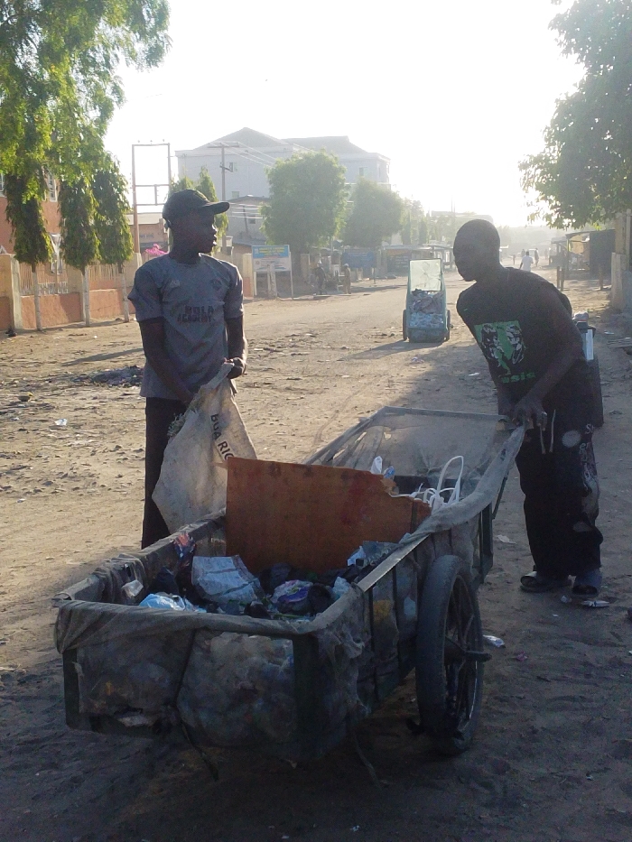 The image displays an outdoor scene in Sabon Gari East, Nigeria, on an unpaved dirt road. Two dark-skinned male individuals are positioned near a two-wheeled, utility-style cart filled with refuse. The individual on the left, wearing a grey t-shirt, dark pants, and a dark baseball cap, holds a large, light-colored sack with "BUA RICE" printed on it, looking towards the right. The individual on the right, wearing a dark t-shirt with a light graphic, dark pants, and sandals, is positioned behind the cart with hands near its handles, looking towards the left. The cart's cargo area contains assorted waste, including plastic bottles and wrappers, with a reddish-brown board visible within the interior. The environment features a bright, sunlit sky, green trees, and distant buildings, including a prominent multi-story structure. Another small, light-blue three-wheeled vehicle is visible further down the dirt road in the mid-ground.