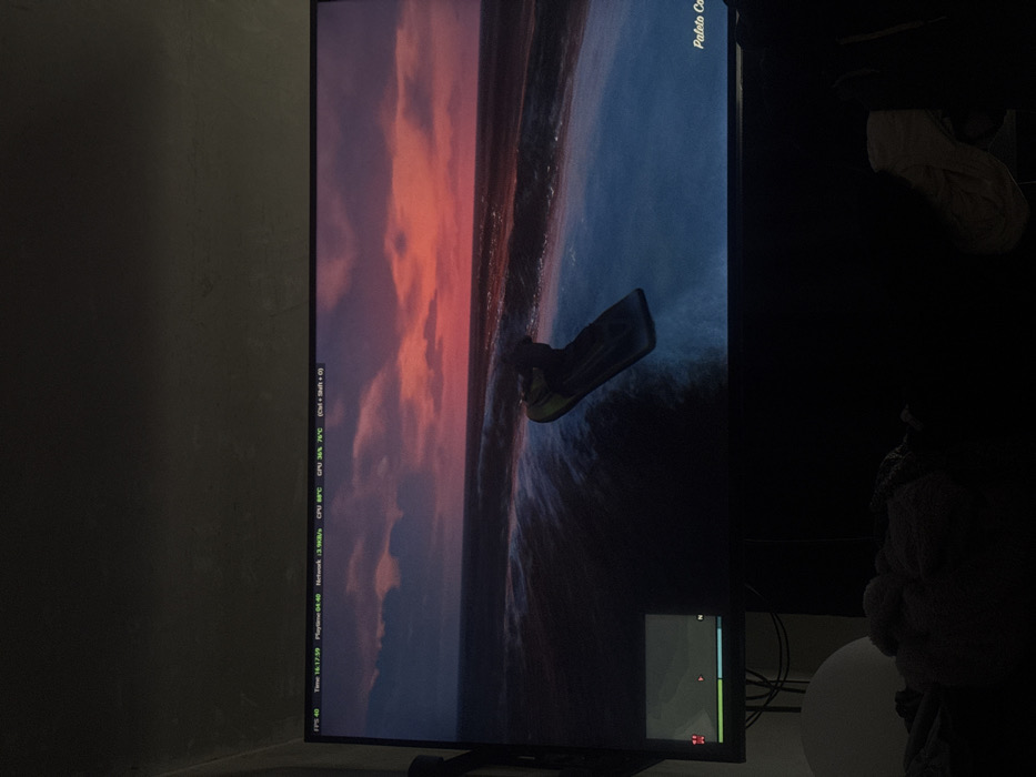 The image depicts a widescreen monitor displaying a video game scene within a dimly lit indoor environment. The image does not show the city of Sofia, Bulgaria. **Monitor Content:** The monitor's screen shows a vivid virtual seascape at sunset. A dark-colored jet ski with a single rider is positioned on a body of water, actively traversing waves. The sky above is dominated by a gradient of deep orange and red hues, indicative of a sunset, with darker clouds interspersed. The water transitions from dark, choppy waves in the foreground to a lighter blue calm closer to the horizon. In the bottom-left corner of the game display, a rectangular mini-map is visible, showing minimal geographic detail and a red marker. The text "Paleto Co" is visible in the bottom-right corner of the game screen, suggesting a location within the game world, likely "Paleto Cove" or "Paleto Bay." An overlay in the top-left corner displays game performance metrics: "FPS 40," "Time 16:17:59" (in-game time), "Playtime 04:40," "Network 3.9KB/s," "CPU 68°C," "GPU 36%," and "76°C" (presumably GPU temperature, with 36% being usage), along with "(Ctrl + Shift + O)" likely indicating a hotkey for the overlay. **Surrounding Environment:** The room is poorly lit, with the monitor providing the primary light source. Above the monitor, a dark, textured wall or ceiling is visible. Below the monitor, a stand is discernible, accompanied by multiple black cables. To the left of the monitor stand, a white spherical object rests on an unseen surface. Various dark, indistinct fabric items, possibly blankets or clothing, are loosely piled on a surface directly beneath the monitor. No human figures are present in the real-world scene, only the virtual character operating the jet ski.