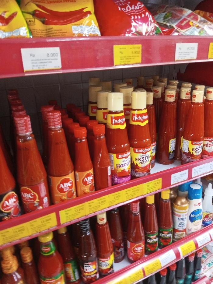 A supermarket shelf displays various brands of chili sauce, ketchup, and mayonnaise. The sauces include "ABC" and "Indofood" varieties, with labels like "Sambal Asli," "Banget," and "Ekstra Pedas." Price tags are visible, ranging from Rp 6.900 to Rp 15.700. Some items appear to be on sale or promotion. The shelf is red and has a metal grid background. Condiment packaging colors are predominantly red, white, and yellow.