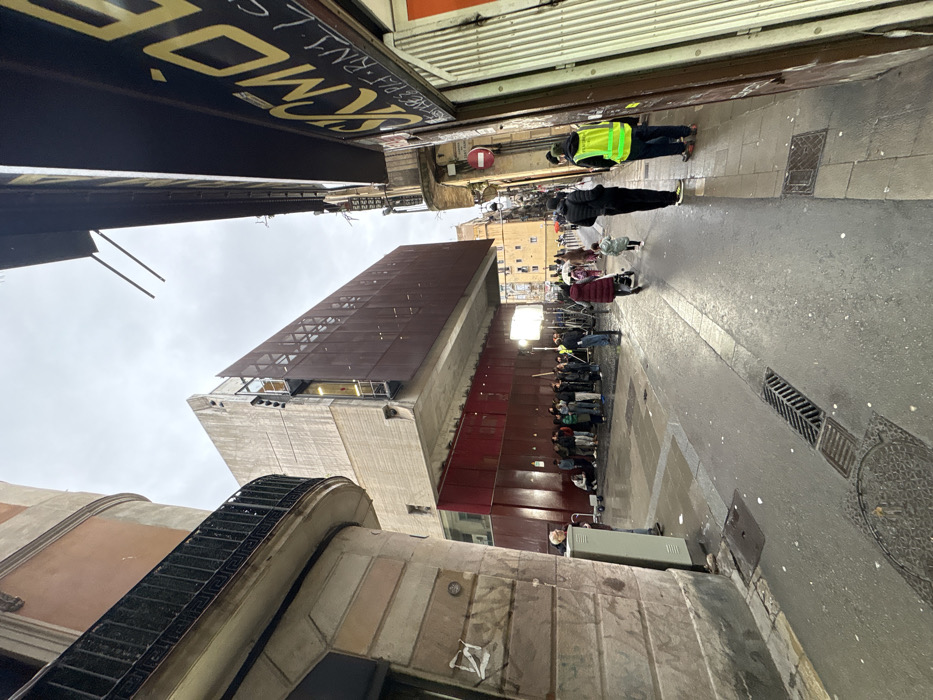 A street view shows a tall, modern building with a concrete base and red upper section. A metal framework tops the structure. People are gathered along the side of the building, possibly waiting in line. A light source illuminates them. The street is narrow, with older buildings on either side. Street signs and drain covers are visible in the pavement. The sky is overcast.
