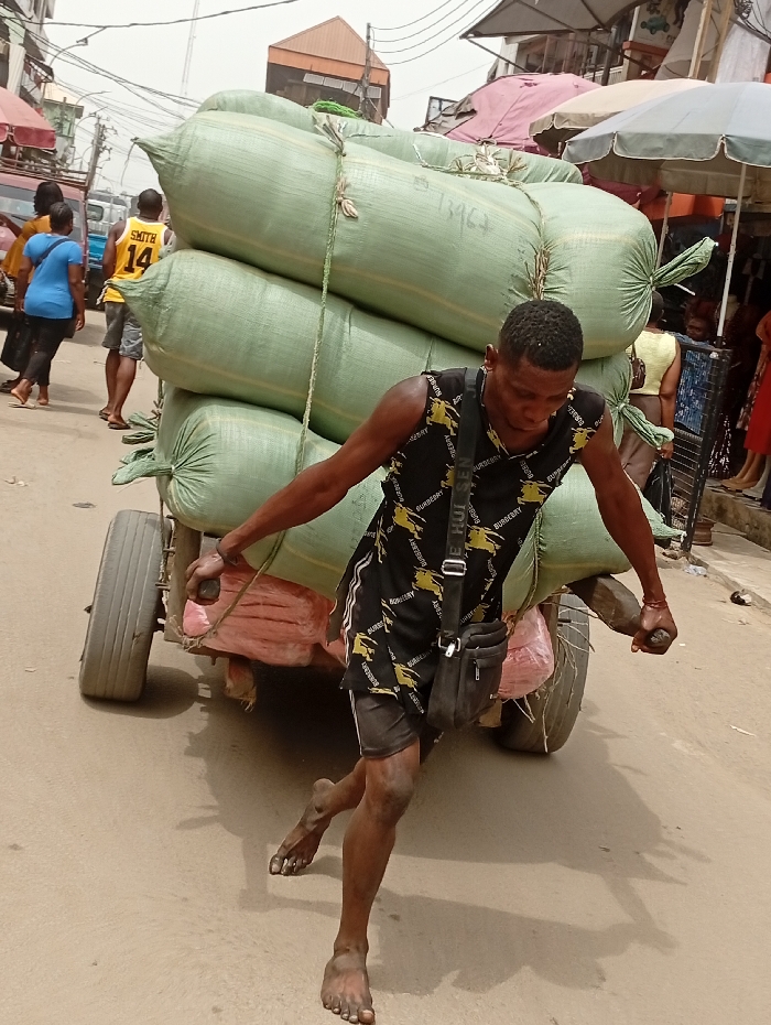 A man pulls a cart piled high with four large, green sacks. The cart has two wheels and appears makeshift. He wears a patterned black and yellow tank top and shorts, with a black shoulder bag. The man is barefoot. He is on a street with other pedestrians and market stalls visible in the background, suggesting a busy market scene. The light is bright and the image is shot at eye level.
