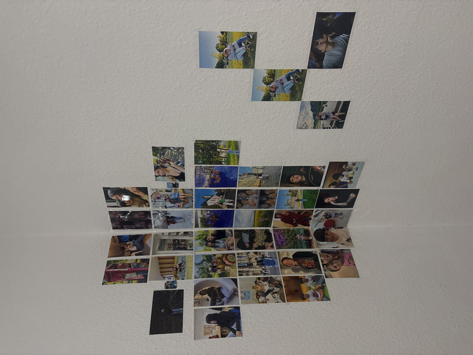 The image displays an interior residential corner where two white, textured walls meet. Approximately 60-70 printed photographs of various rectangular and square formats are affixed to the walls, creating an informal collage. The main cluster of photos is concentrated around the corner, extending predominantly across the left wall and partially onto the right. These photos depict numerous individuals, primarily young adults and some children, engaged in diverse activities and located in various settings, including outdoor scenes (parks, streets, natural landscapes, bodies of water), indoor environments (rooms, kitchens), and urban backdrops with architecture. Subjects are observed sitting, standing, walking, posing, and interacting in pairs or groups. Actions captured include smiling, embracing, and casual observation. A secondary arrangement of four distinct photographs is positioned on the right wall, separate from the main cluster. These photos individually feature pairs of people: two show individuals seated on grass in an outdoor park-like environment, one displays two individuals by a body of water or on a bridge, and one horizontal close-up depicts two individuals in an intimate pose, possibly kissing. The walls are evenly lit. The location within the city is Unknown, Unknown.