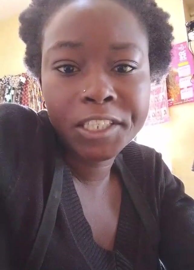 A dark-skinned person with short, curly hair and a nose piercing looks directly into the camera. They wear a black V-neck shirt with thin straps visible over the shoulders. The person opens and closes their mouth, revealing their teeth. The background is slightly out of focus and shows a rack of clothing and a poster on a light-colored wall.