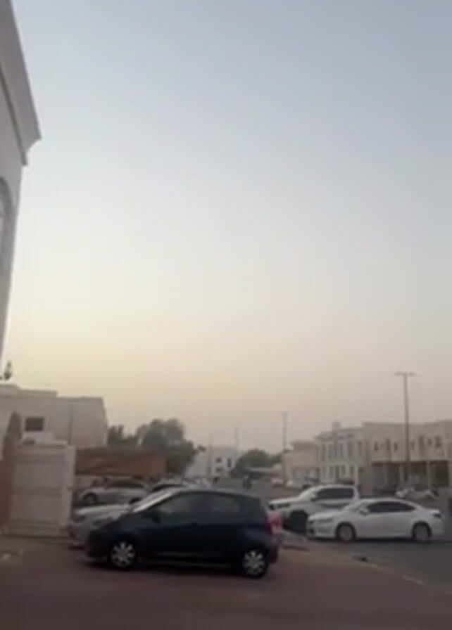 suburban street with multiple parked cars and buildings that appear to be residential. The buildings are uniformly low-rise, and a muted color palette suggests an arid climate. The sky is overcast, and the lighting indicates it's either early morning or late afternoon. There are streetlights visible, and minimal traffic is moving along the road. The video appears to be taken from a pedestrian perspective.