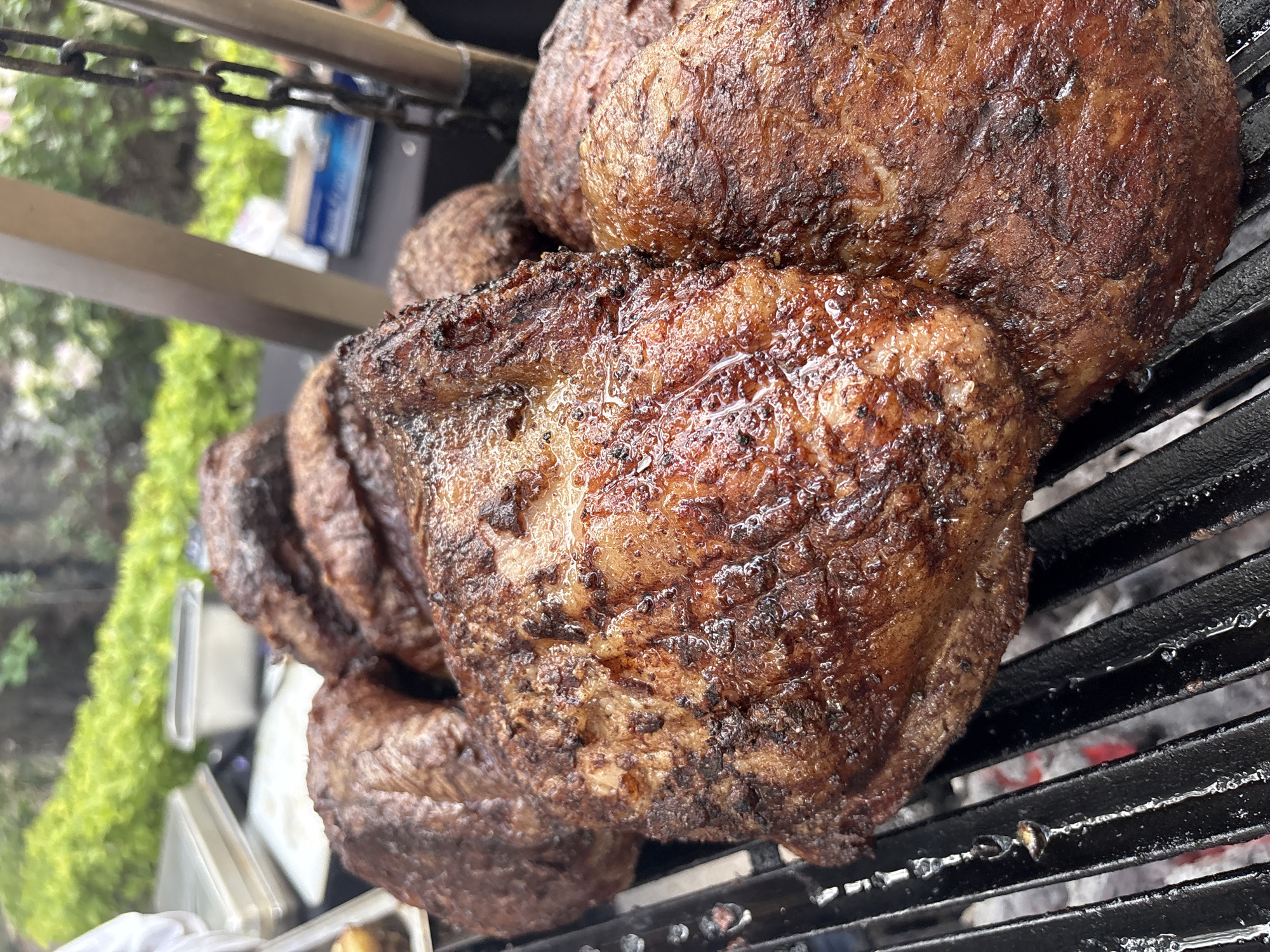 The image depicts cooked meat, possibly beef, on a black metal grill