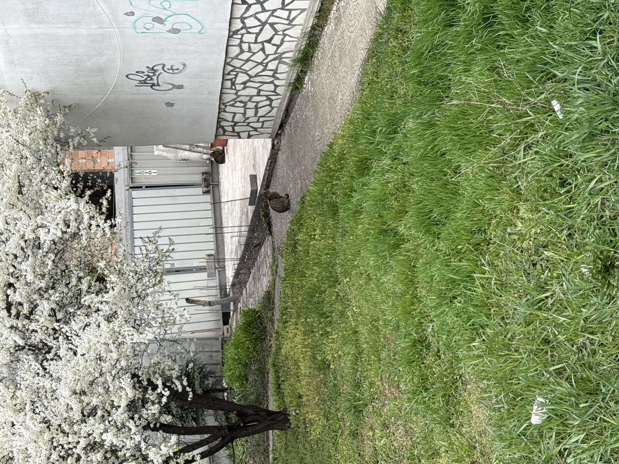 The image depicts an outdoor scene, possibly in Sofia, Bulgaria, featuring a narrow paved walkway bordered by a building on one side and a grassy area on the other. The building has a concrete base with graffiti, a tiled mosaic section, and a metal structure above. A blooming tree with white flowers is present on the left side of the image. Two cats are visible on the walkway. Litter is scattered in the grass. The photo is taken from an elevated angle, and the perspective is slightly tilted.
