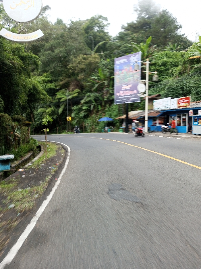 The image displays a curved asphalt road within a verdant, hilly environment, located in the city of Phoxay, Laos. The road occupies the foreground and midground, featuring a solid white line delineating its left edge and a yellow line near the center, suggesting a dividing or no-passing zone. The road surface exhibits patches and wear. To the left, a concrete drainage channel runs parallel to the road, bordered by overgrown grass and scattered debris. Above this, a white, ornate sign hangs, featuring golden Arabic script (appearing as "الرحمن") and the Latin text "AIR RAHMAAN". Lush green foliage, including dense trees and undergrowth, covers the hillside rising steeply from the left and extending into the background. A yellow diamond-shaped sign, indicating a curve to the right, is partially visible among the trees on the left. A dark-colored motorcycle is parked further along the left side of the road. On the right side of the road, a large vertical billboard displays a colorful advertisement, mounted on a light-colored utility pole that also supports a smaller circular sign. Behind the billboard, a series of single-story buildings with blue and white facades are present, suggesting commercial establishments. A person wearing a red shirt is standing near the entrance of one blue building, which has a red sign above it. Another blue building with a white sign is adjacent. A blue parasol is positioned outside these buildings. A person on a red motorcycle is observed in motion on the right side of the road, heading away from the viewer, with motion blur affecting its clarity. The sky is overcast, contributing to a muted light across the scene.