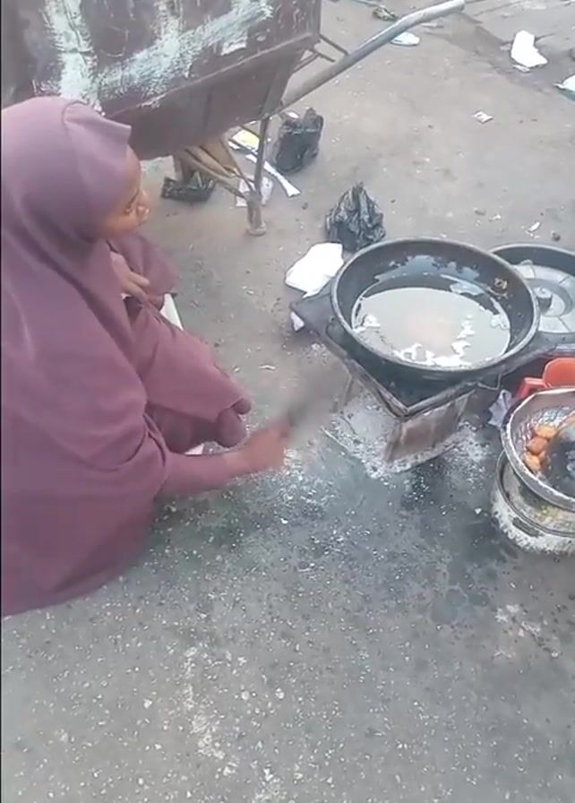 A young woman wearing a maroon hijab is sitting on the ground next to a small portable stove. She is using a long metal utensil to tend to something frying in a black pan filled with oil on top of the stove. To her right is a strainer filled with fried food. To her left is a rusty metal cart, and the ground around her is littered with trash. The background is a blurry street scene.