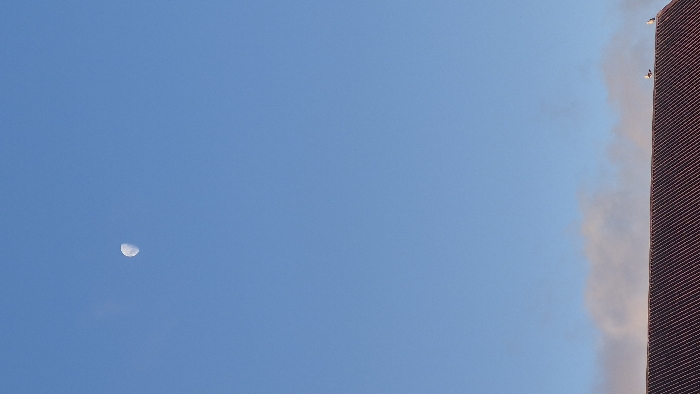 A serene blue sky dominates the image, featuring a crescent moon in the lower left quadrant. The right edge of the frame displays a structure, possibly a building, characterized by a patterned facade. Hints of wispy clouds are visible next to the structure. Two birds are perched on the edge of the structure.