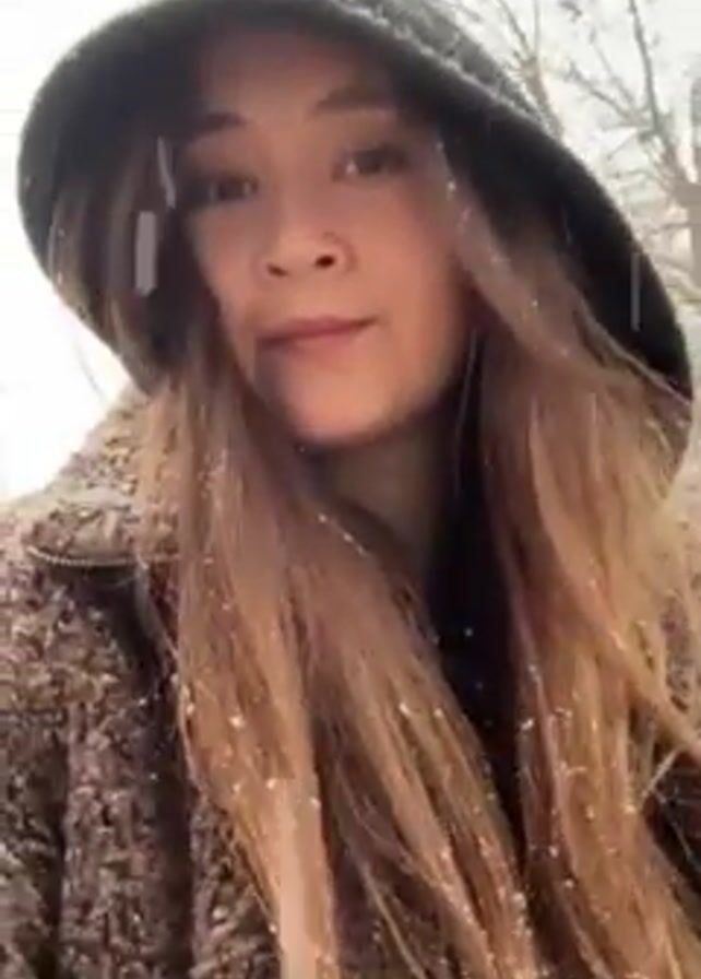 A woman with long brown hair and wearing a hooded jacket is standing outside in the snow. Snowflakes are visible on her hair and jacket, and there are bare trees in the background. She is looking at the camera.