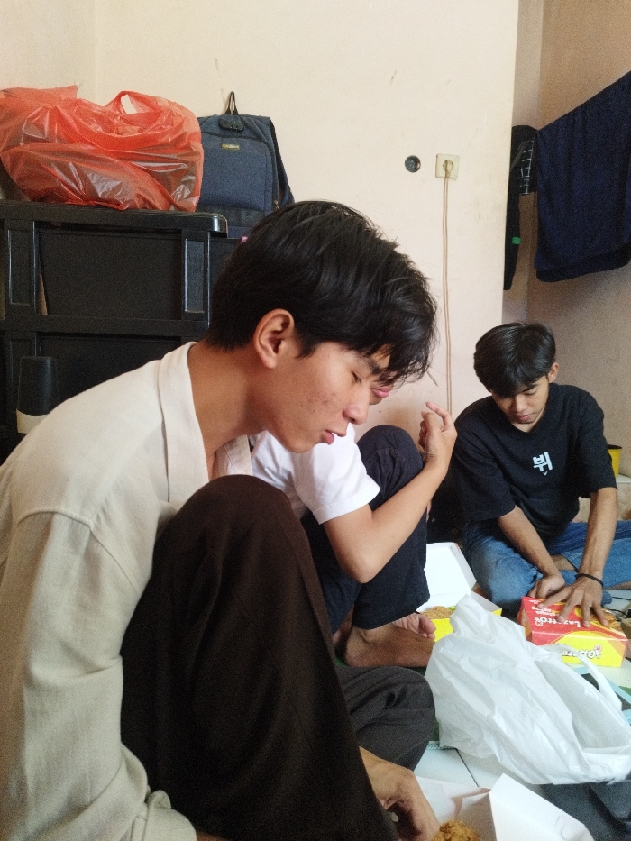 In an indoor room in Muka, Indonesia, three young males are seated on a light-colored tiled floor, engaging in a casual meal. The room features plain light-colored walls. On the left side, a black multi-drawer plastic storage unit holds an orange plastic bag and a dark blue backpack. On the right wall, an electrical outlet with a plugged-in white cord is visible, alongside dark clothing hanging from a hook. In the foreground, a male with dark hair, wearing a light-colored long-sleeved shirt and dark trousers, looks downward towards an open white food box containing fried items. Partially obscured behind him, a second male in a white t-shirt is visible. To the right, a third male with dark hair, wearing a black t-shirt with white Korean characters and blue jeans, handles a red and yellow "Laz-rok" branded box. Several open white food containers filled with fried items and a white plastic bag are scattered on the floor between the individuals.