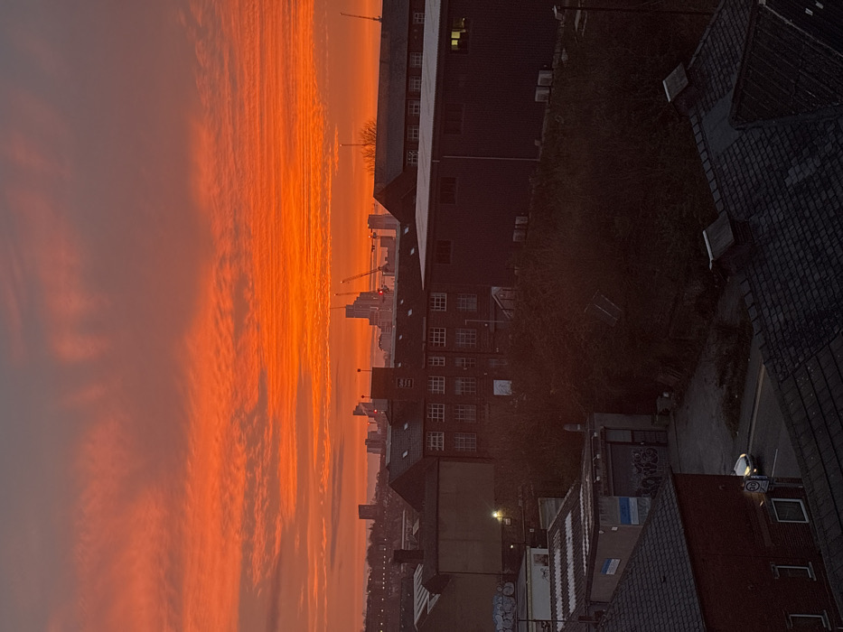- "The image displays an urban landscape at sunrise or sunset, characterized by a vibrant orange-red sky with prominent horizontally layered altocumulus clouds" by FM-WFmyx2, licensed under CC BY 4.0