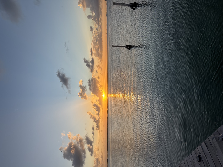 A serene sunset over water dominates the scene. The sun, positioned centrally, casts a golden reflection on the water's surface. Clouds in hues of gray and orange dot the sky, illuminated by the sun's glow. Two wooden posts rise from the water. The water's texture appears slightly rippled. A wooden structure is visible along the lower-right edge of the frame.