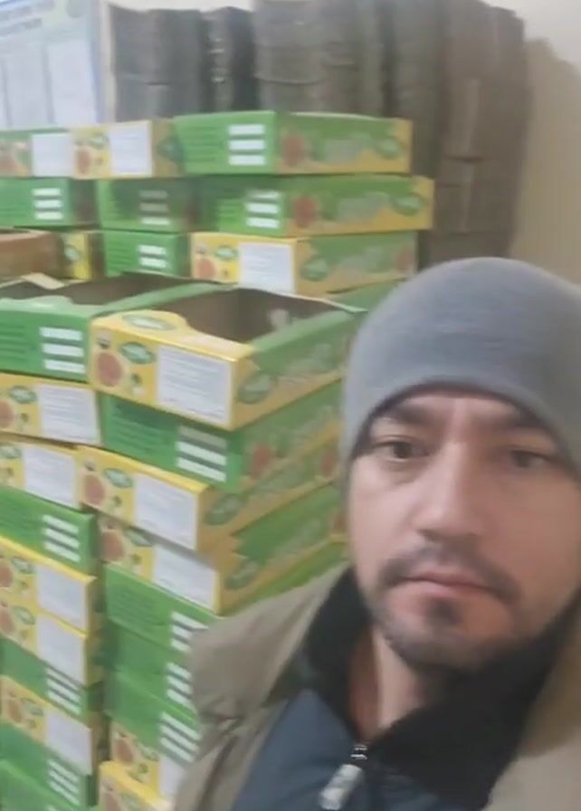 man taking a selfie in what appears to be a storage or warehouse-like environment. He's wearing a gray beanie, a dark zip-up jacket under a tan jacket. He has a short beard. Behind him is a stack of boxes with green, white and yellow labeling with an image of a fruit. To the right of the boxes, there is a blurry stack of brown cardboard that looks like unfolded box material leaned against the wall. The wall is white. The man looks at the camera, slightly smiles, and then the video ends.