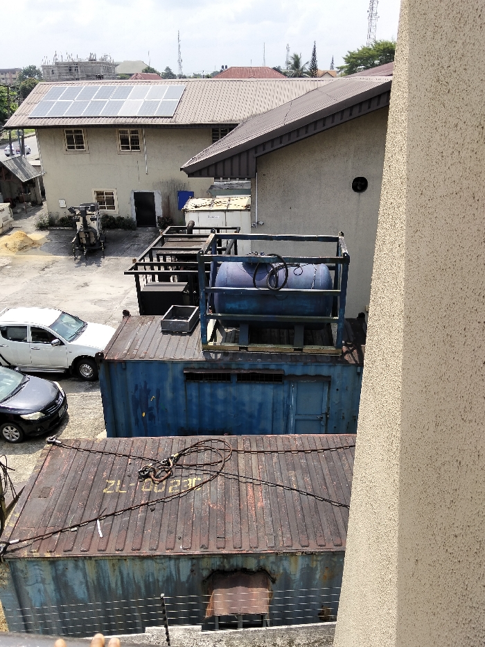 This image presents an elevated, static view of an industrial or commercial yard in Port-Harcourt, Nigeria, under a bright, partially cloudy sky. The right side of the frame is occupied by a coarse, light-colored concrete wall, indicating the vantage point is from an adjacent structure. In the mid-ground, two large industrial containers are prominently featured. The lowest and most forward container is blue-green, heavily weathered, and rusted, with the yellow alphanumeric code "ZL 00230" stenciled on its corrugated roof. A coiled metal chain and other metal objects rest on this roof. Behind and slightly to the right, another blue container, likely a modified shipping container, serves as an enclosure, featuring horizontal ventilation slits and a visible door. Mounted on top of this container is a metal framework supporting a horizontal, blue cylindrical tank, possibly for fuel or water, with black hoses or cables attached to its side. A smaller, dark rectangular container sits nearby on the same surface. To the left of these containers, a paved ground area shows two parked vehicles: a white compact SUV and a black sedan, both seen from the rear. Further left, a mound of beige granular material, likely sand, is visible next to a mobile industrial mixer or pump on wheels. The background is dominated by a two-story building with a light-colored stucco facade and a brown corrugated metal roof. This roof is fitted with 16 visible solar panels arranged in two rows. The building features multiple rectangular windows with white frames and a dark ground-level door. To its right, an adjacent single-story structure with a similar facade includes a circular opening or vent. Beyond these immediate structures, the urban landscape of Port-Harcourt is visible, characterized by distant rooftops, construction frameworks with exposed rebar, several communication towers, and sparse green foliage. No people or active interactions are visible within the scene.