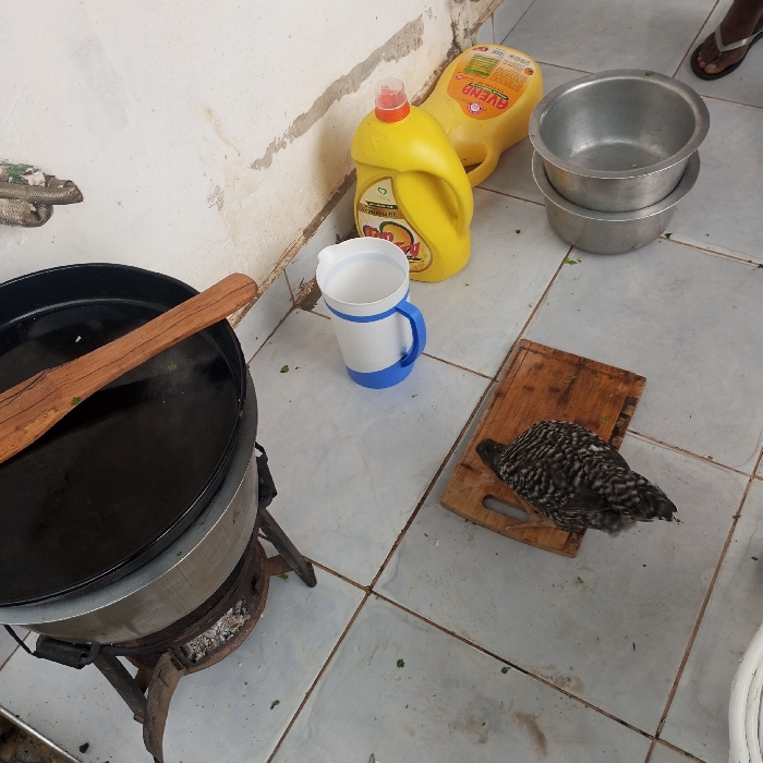 The scene is set in Mahiakalo ward, Kenya, within what appears to be a covered outdoor or semi-enclosed area featuring a light-colored, stained wall and a tiled floor. Green plant debris is scattered on the light-grey floor tiles. On the left, a metal brazier containing ash supports a large metal pot. Resting on this pot is a black, flat-bottomed cooking pan, across which a wooden spatula is placed. Against the wall, two yellow plastic bottles, one upright and one on its side, contain a liquid. A white plastic pitcher with a blue handle stands on the floor nearby. Adjacent to these, two silver-colored metal bowls are stacked. In the mid-foreground, a wooden cutting board with a handle cutout lies on the tiles, serving as a perch for a live chicken with black and white speckled feathers, which has its head lowered. A bare foot, wearing a dark flip-flop, is partially visible in the upper right portion of the frame. A white coiled hose is partially visible in the lower right corner.