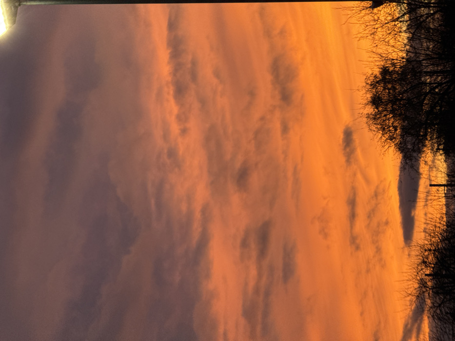 The image displays an outdoor scene in Bischheim, France, during twilight hours. The sky occupies the majority of the frame, exhibiting a strong color gradient from vibrant orange near the horizon, transitioning to reddish-purple hues in the upper portion. Multiple grey cloud formations are visible, scattered across the sky. In the lower section, the dark silhouettes of numerous bare tree branches, indicative of deciduous trees without foliage, are prominent. A black utility pole, topped with an illuminated street lamp, is partially visible along the extreme right edge of the frame, extending downwards from the top. No human figures or direct activities are depicted.