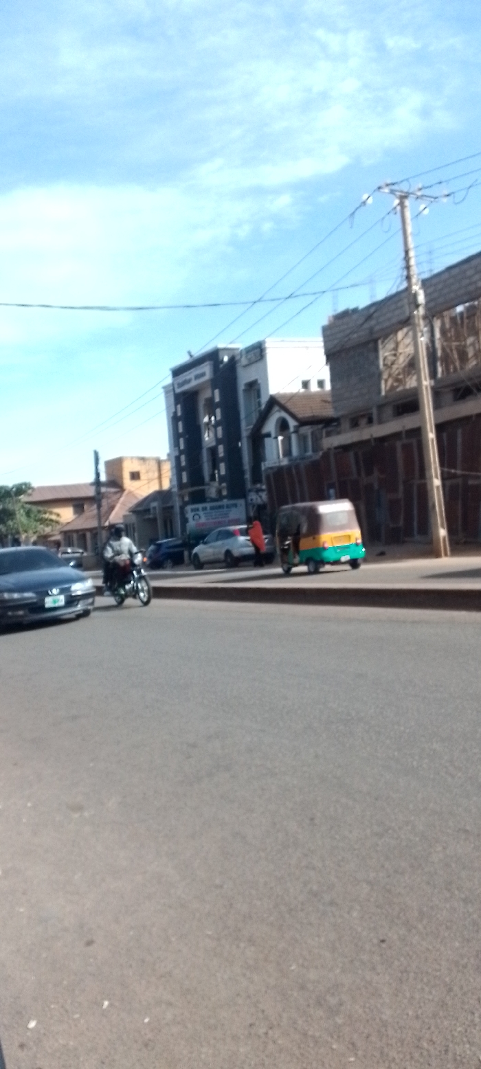 A street scene depicts a gray car and a motorcycle traveling on a paved road. Buildings line the background, including one with "Suffah House" printed on its facade. A small, three-wheeled vehicle with brown, yellow, and green colors is parked on the side of the road. Utility poles and wires are visible overhead against a blue sky with light clouds.