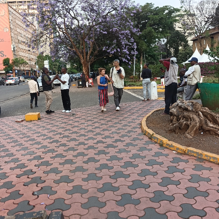 An urban street scene in Nairobi, Kenya, captures a pedestrian area adjacent to a roadway. The foreground features a pedestrian pathway paved with interlocking reddish-brown and dark grey pavers in a "bone" pattern. A yellow rectangular block rests on the pavement to the left. To the right, a raised dirt planter with exposed tree roots and a yellow-painted curb separates the walkway. In the midground, several individuals are present. On the left, two African males face each other, possibly interacting; one wears a dark vest over a light shirt, the other a white t-shirt. Behind them, another African male in a light jacket walks away from the camera towards the street, where cars are visible. In the center, a Caucasian couple walks left-to-right; the woman wears a blue top and striped pants, carrying a light bag, while the man, with grey hair, wears a light shirt and dark pants, holding a dark object. Further right, an African male in a white cap, red shirt, and light vest stands with hands on his head, facing away. Another African male in a dark cap and light vest leans against a large green container or structure. A third African male in a black shirt stands further back. In the background, a large Jacaranda tree with purple blossoms dominates the left, partially obscuring multi-story buildings, one with a reddish-orange facade. Green foliage and white tents are visible on the right. Vehicles are parked and moving on the street behind the main group of people. The lighting suggests late afternoon or early evening.