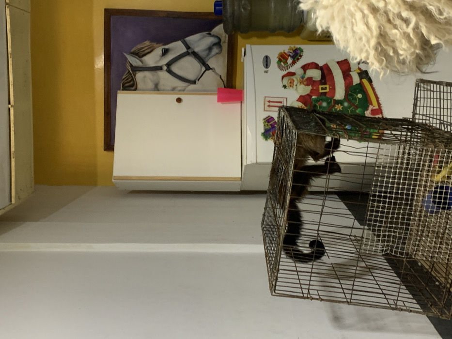 The scene depicts an interior space in Juan Griego, Venezuela, characterized by utilitarian furnishings and animal presence. A rusty, wire-mesh animal cage occupies the lower-left and central foreground, with a dark-furred animal, possibly a ferret or similar mustelid, draped over its top edge and partially inside, exhibiting a curled tail. Inside the cage, blue and yellow objects are visible. The background features a white wall on the left corner, transitioning to a bright yellow wall on the right. A white, two-door cabinet, with its right door slightly ajar, is mounted above a white refrigerator. A pink plastic cup rests on the refrigerator's top surface. The refrigerator door is adorned with multiple Christmas-themed magnets, including a prominent Santa Claus figure and wrapped presents. To the right of the refrigerator, a large, clear plastic water dispenser bottle with a blue cap is present. A framed painting of a white horse's head with a bridle, set against a purple background, is mounted on the yellow wall behind the cabinet. A segment of a fluffy, light-colored object, resembling animal fur or a rug, is partially visible in the bottom right corner. The flooring is dark. No human subjects are present.