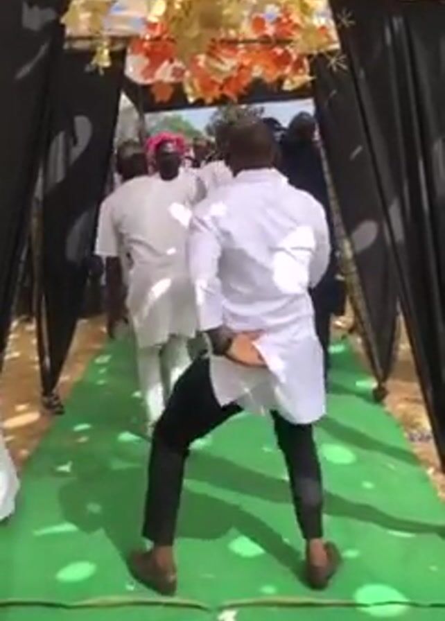 man dancing on a green carpet under a decorated archway. The man is wearing a white shirt, black pants, and brown shoes. He is facing away from the camera and moves his hips and legs. There are other people in the background, most of whom are wearing white clothes. The archway is decorated with black and white fabric and gold and orange foliage.